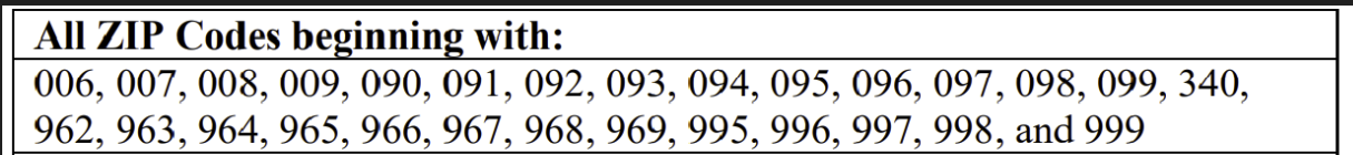 Pakete, die weniger als 5 lbs wiegen, werden innerhalb der Vereinigten Staaten für 9,21 USD (8,77 USD + Gebühren) versandt, mit Ausnahme dieser Postleitzahlengebiete: