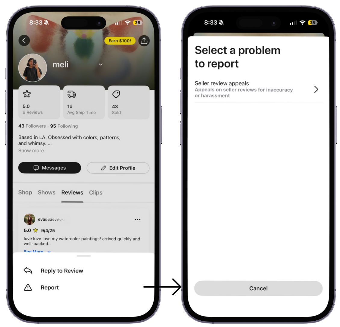 Wenn eine Bewertung eindeutig gegen unsere Community-Richtlinien verstößt (zum Beispiel durch Belästigung oder Fehlinformationen), kannst du sie über die Whatnot-App melden.
