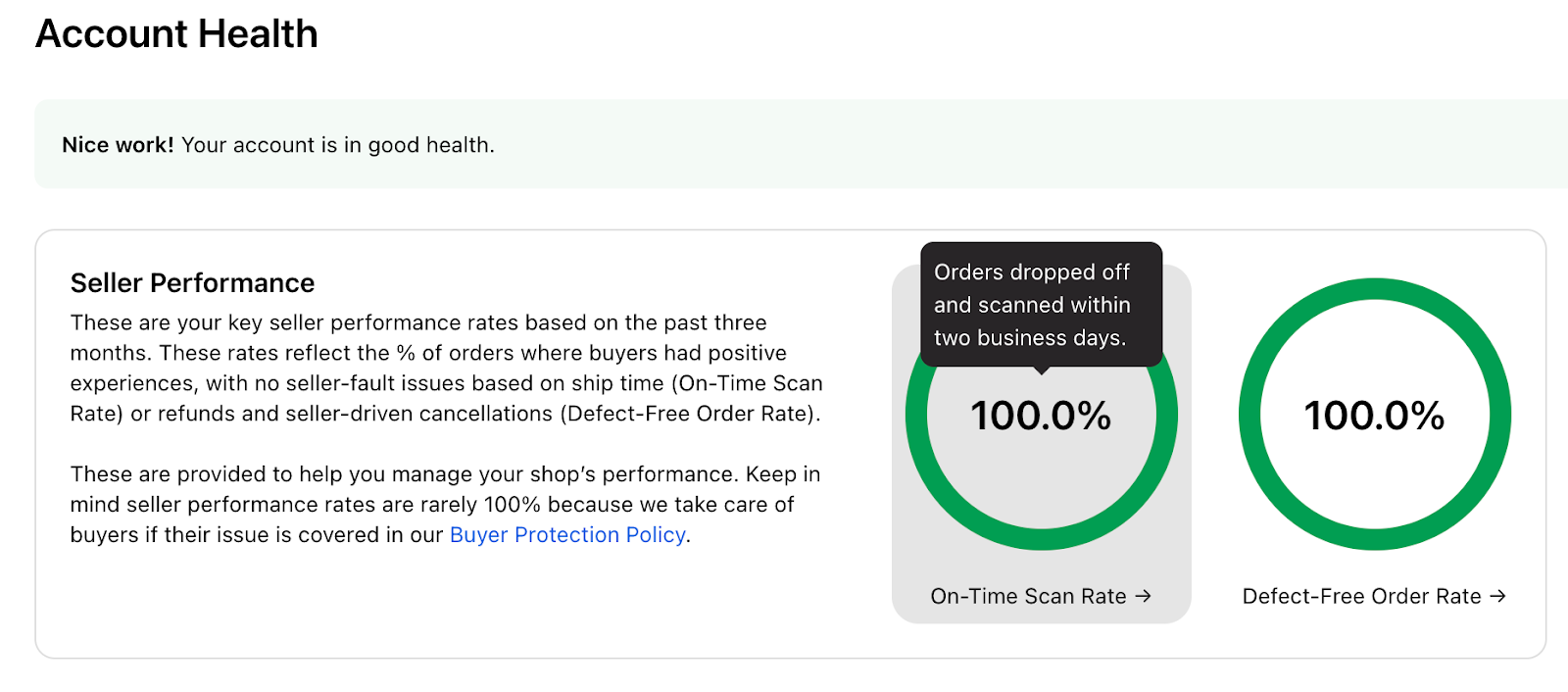 Das Dashboard „Kontostatus“ ist in zwei Abschnitte unterteilt: Verkäuferleistung und Richtlinienstatus. Der Abschnitt „Verkäuferleistung“ wird nur Verkäufern angezeigt, um ihnen bei der Überwachung wichtiger Leistungskennzahlen für ihr Unternehmen zu helfen, während der Abschnitt „Richtlinienstatus“ allen Nutzern hilft, Verstöße gegen die Community-Richtlinien zu überwachen.