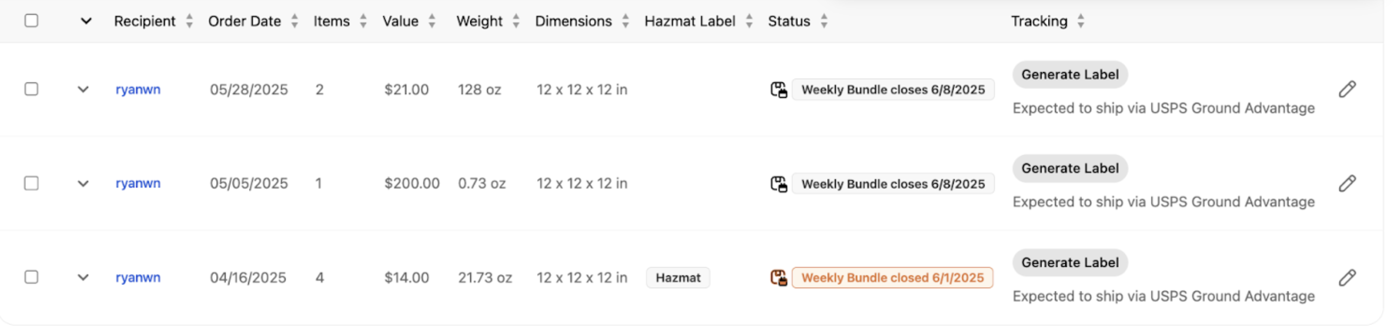 - Wähle unter den Sendungen den Livestream aus und generiere Etiketten. Achte darauf, wöchentliche Bundles beim Generieren von Etiketten zu überspringen. Wenn du ein Bundle für einen wöchentlichen Versand generierst, wird das Bundle geschlossen.