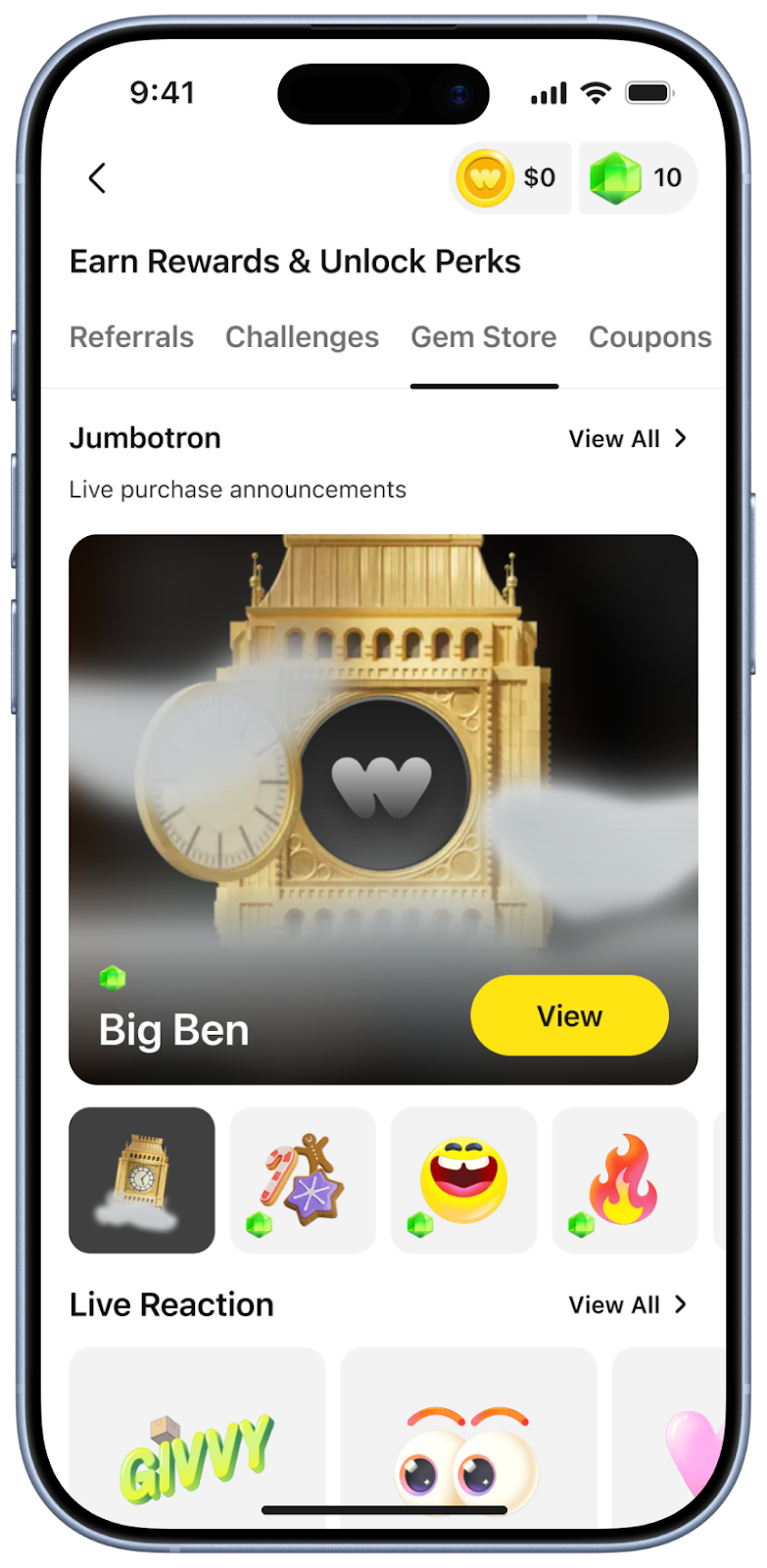 Juwelen sind neue virtuelle Punkte auf Whatnot, mit denen Käufer*innen für ihre Aktivitäten belohnt werden. Käufer*innen können Juwelen verdienen, indem sie Challenges absolvieren. Diese können sie dann verwenden, um digitale Prämien wie benutzerdefinierte Jumbotrons (Kurzanimationen zum Feiern von Käufen), Reaktionen (durch zweimaliges Tippen während einer Live-Show kannst du deine Gefühle ausdrücken) und Anreize wie Coupons freizuschalten.