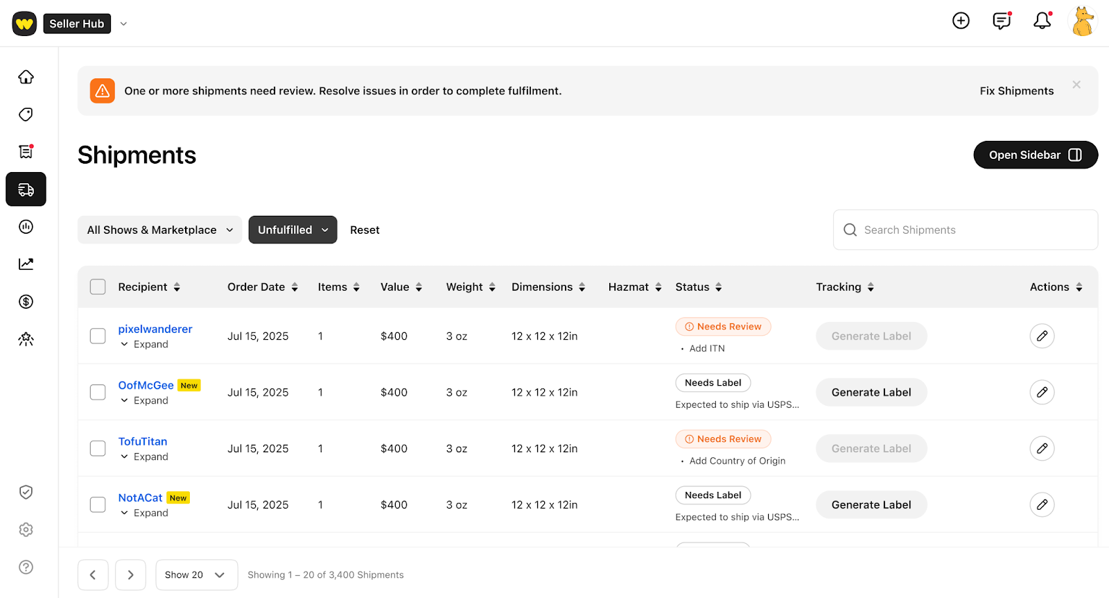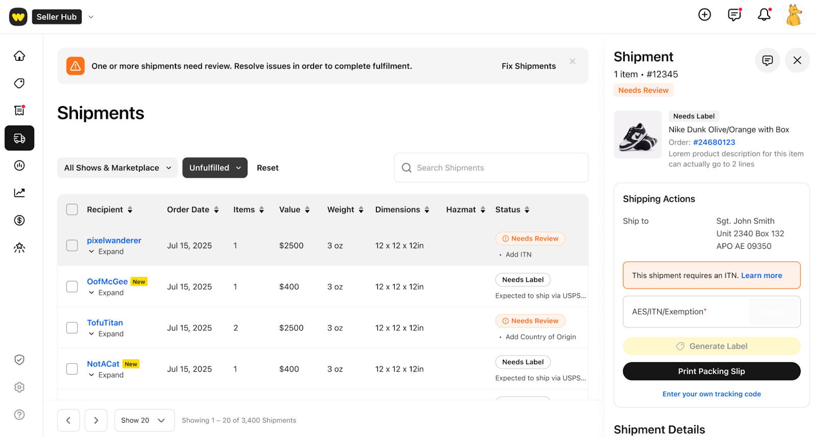 Shipments requiring an ITN will be automatically marked as “Needs Review” in Seller Hub.