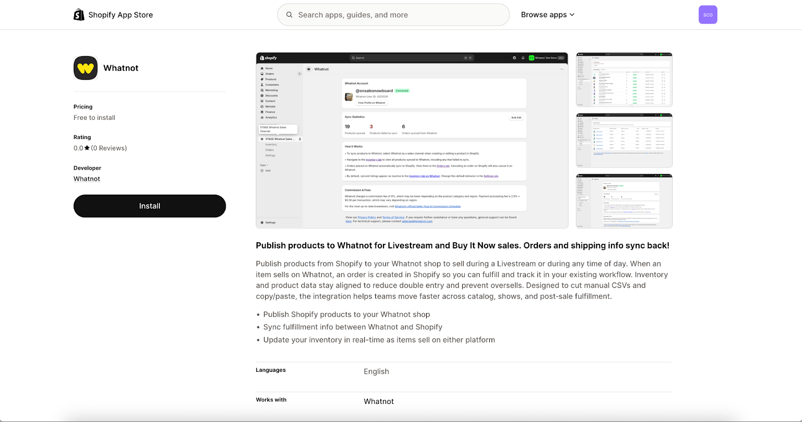 Search for “Whatnot” in the Shopify App Store, or visit https://apps.shopify.com/whatnot in your web browser and click Install.