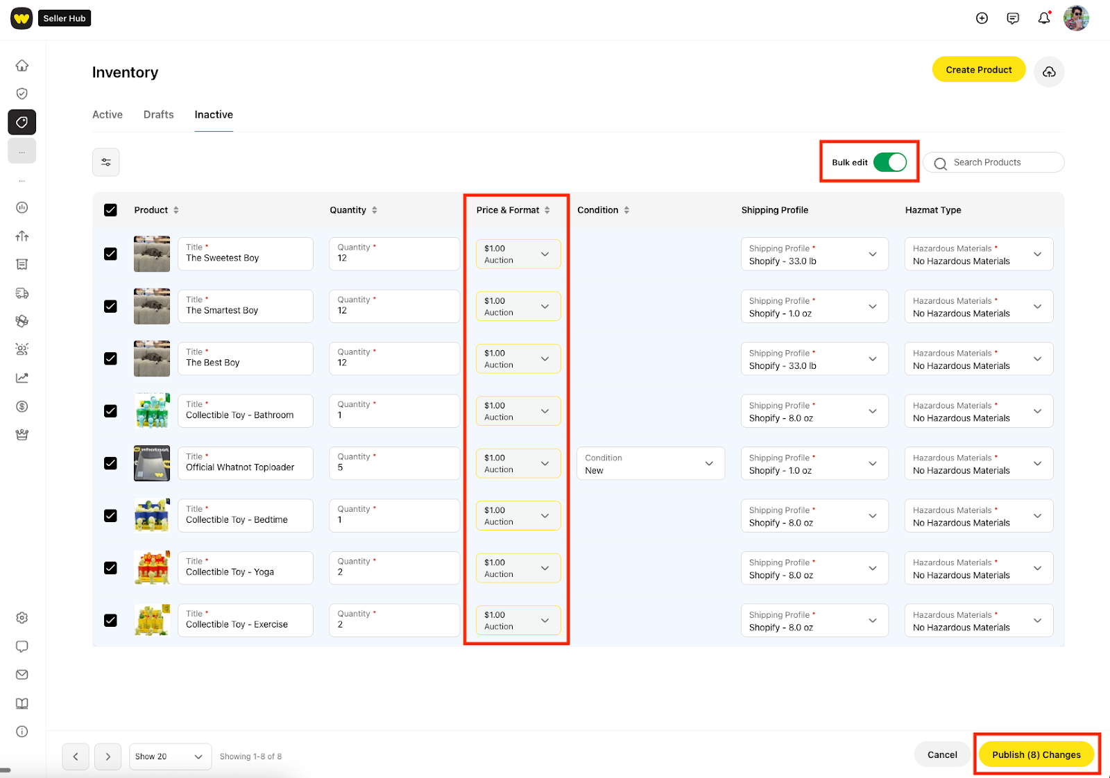 Yes. Bulk editing format will also update prices for all items in the batch. After bulk editing, use Force Sync All Products in your Whatnot channel app settings to restore correct prices from Shopify.