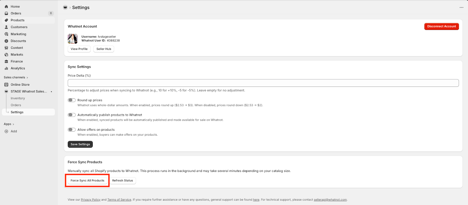 By default, inventory created exclusively on Whatnot are not synced back to Shopify. However, if you go to the Settings page in the Whatnot Sales Channel app there’s a toggle that you can enable to sync orders from Whatnot.