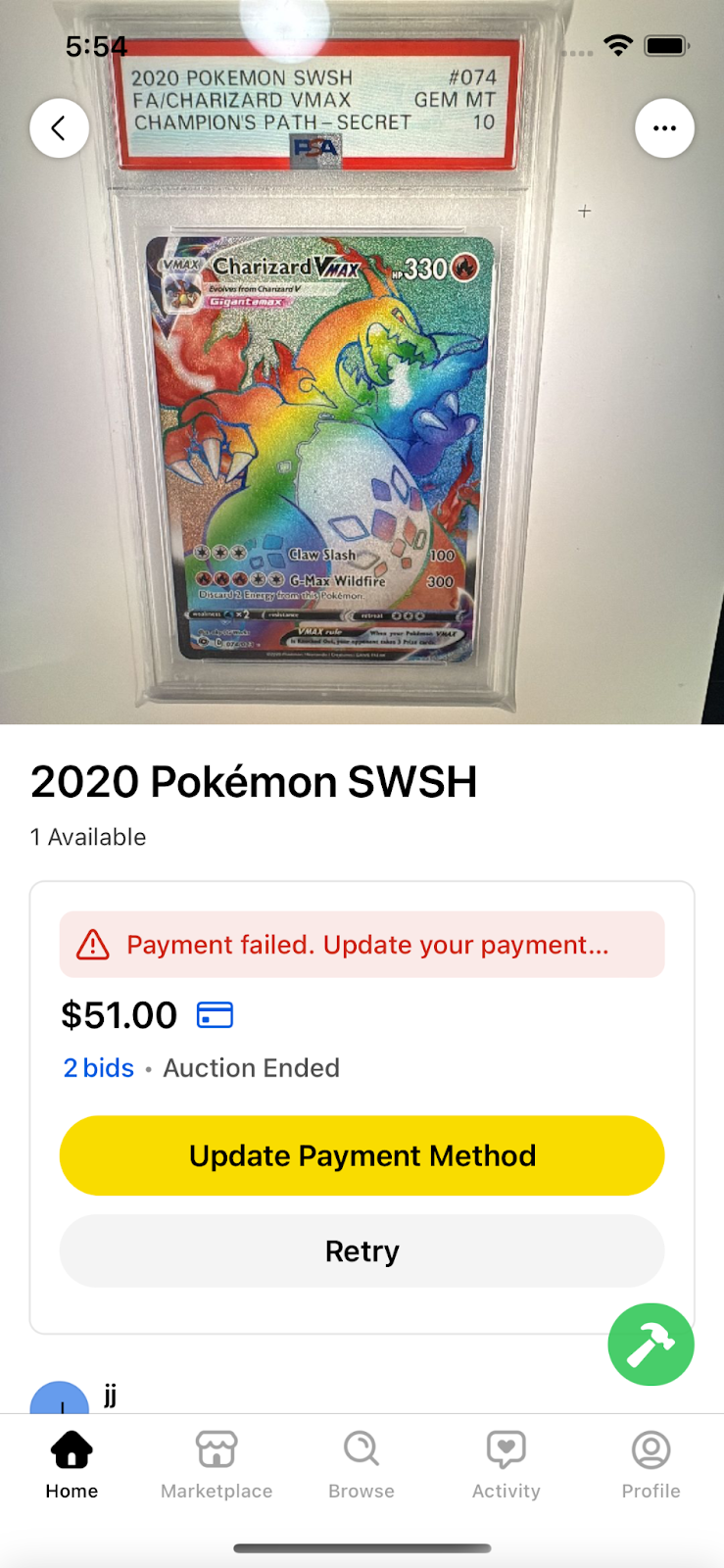 Tout comme pour les ventes aux enchères en live traditionnelles, les enchères peuvent faire l'objet de paiements en attente. Dans de tels cas, l'acheteur verra une fenêtre contextuelle lui permettant de mettre à jour ses informations de paiement et de procéder à nouveau au paiement. Cette fenêtre contextuelle apparaît dans deux cas :