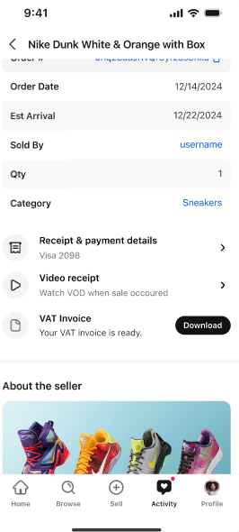 Si tu as besoin d'une facture avec TVA et que tu ne vois pas l’option permettant d'en télécharger une, cela signifie que le vendeur ne l'a pas encore générée. Dans ce cas, contacte directement le vendeur (par exemple, par DM sur Whatnot) et demande-lui de créer la facture pour ta commande.