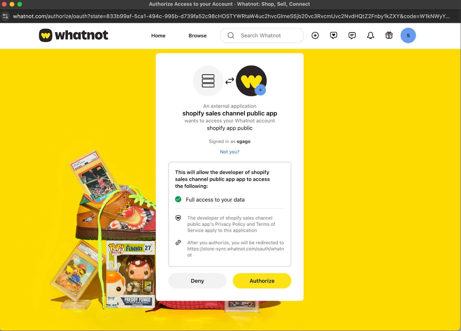 Clique sur Autoriser. La fenêtre se fermera et tes comptes seront désormais liés. Tu peux vérifier la connexion en cliquant sur l'application Whatnot dans Shopify et en vérifiant les détails de ton compte.