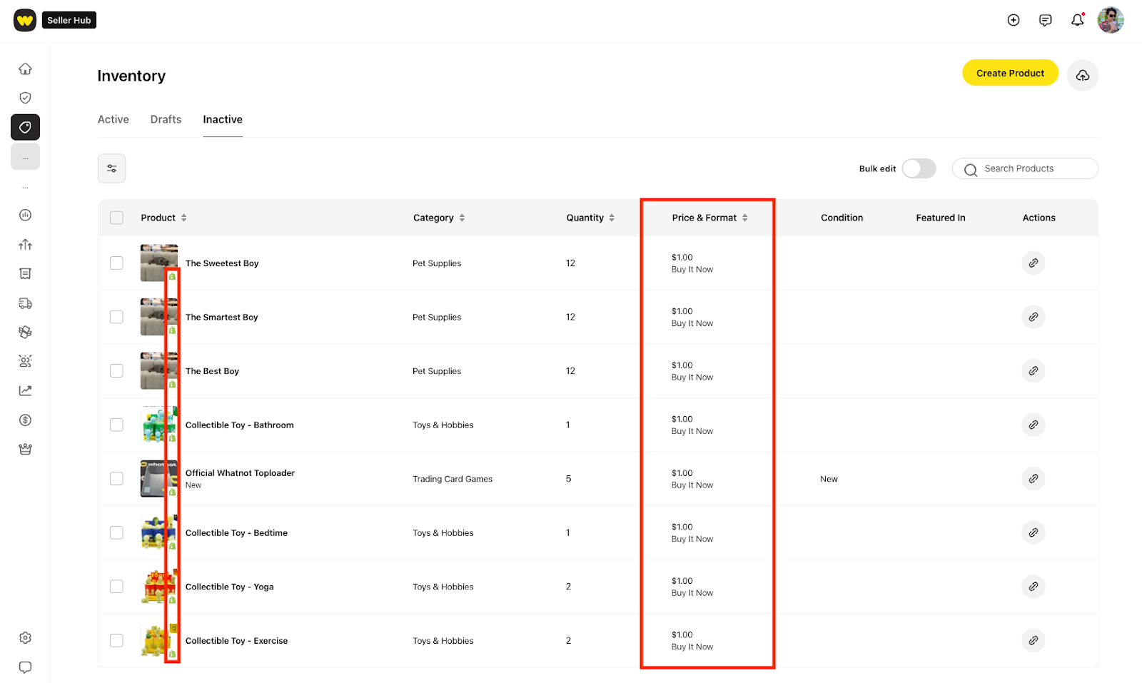 Pour modifier le format de plusieurs annonces à la fois, accède à l'outil de modification groupée, puis utilise Forcer la synchronisation de tous les produits dans les paramètres de l'application du canal de vente Whatnot pour rétablir les prix corrects.