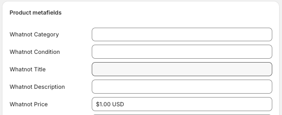 💡 Astuce : C'est sur cette page que tu peux ajouter des champs méta spécifiques à Whatnot sur Shopify (tels que « Prix Whatnot », « Titre Whatnot », « Description Whatnot » ou « État Whatnot ») afin de définir des valeurs qui n'apparaîtront que sur Whatnot sans affecter tes annonces Shopify.