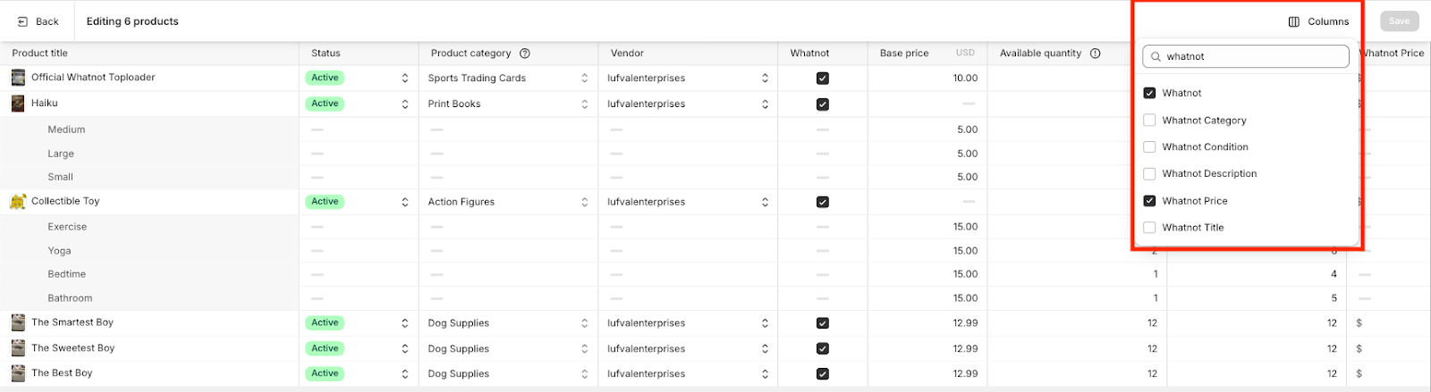 Pour définir le prix Whatnot sur plusieurs produits à la fois, utilise l'éditeur en bloc de Shopify : accède à Produits, sélectionne les articles, clique sur Modifier en bloc, ajoute la colonne Prix Whatnot et saisis les valeurs souhaitées.
