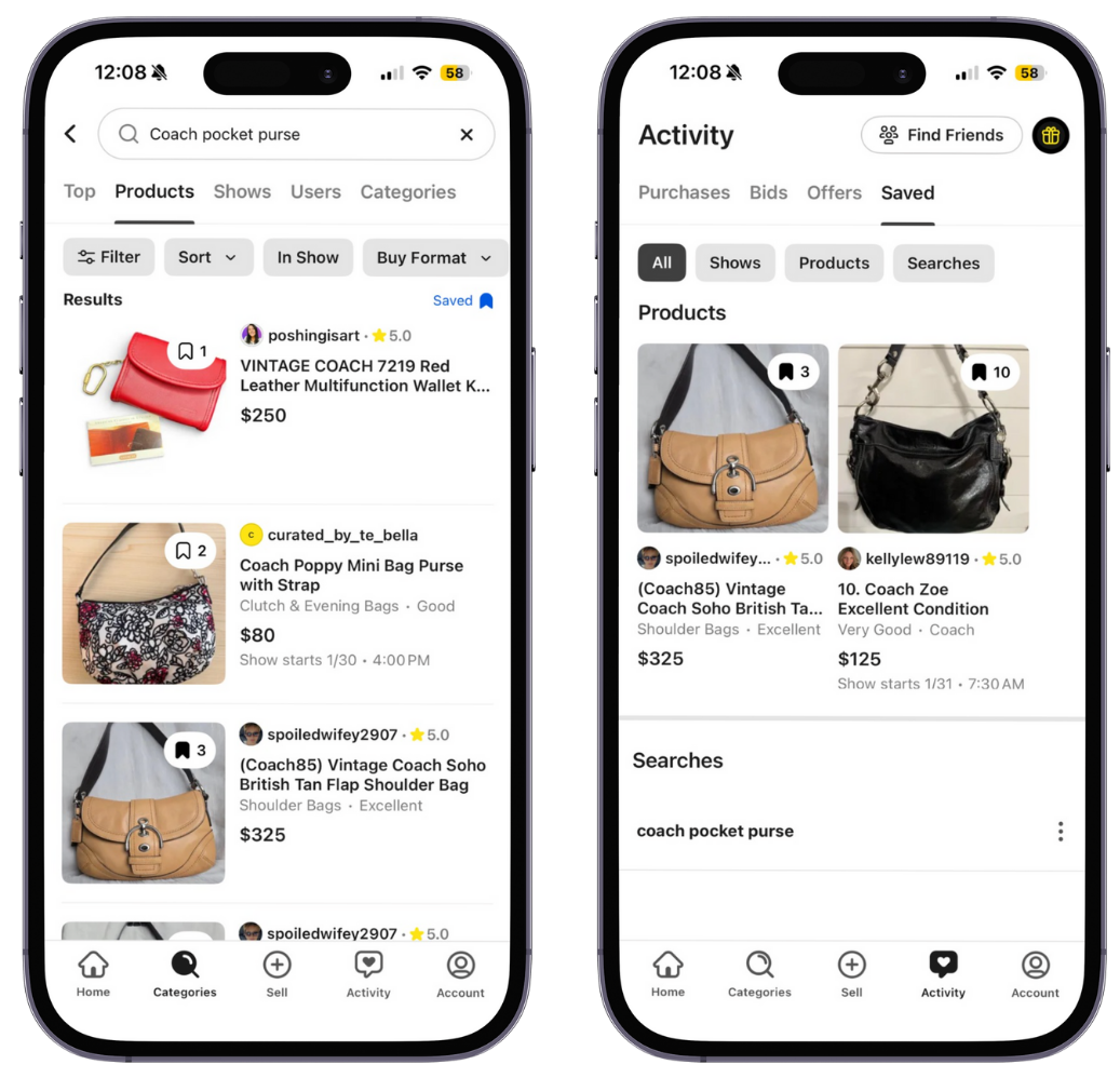- Tu recevras une notification lorsqu'un livestream ou un produit ajouté aux favoris passera en live, ou lorsque de nouveaux résultats correspondront à une recherche enregistrée (assure-toi que les notifications sont activées).