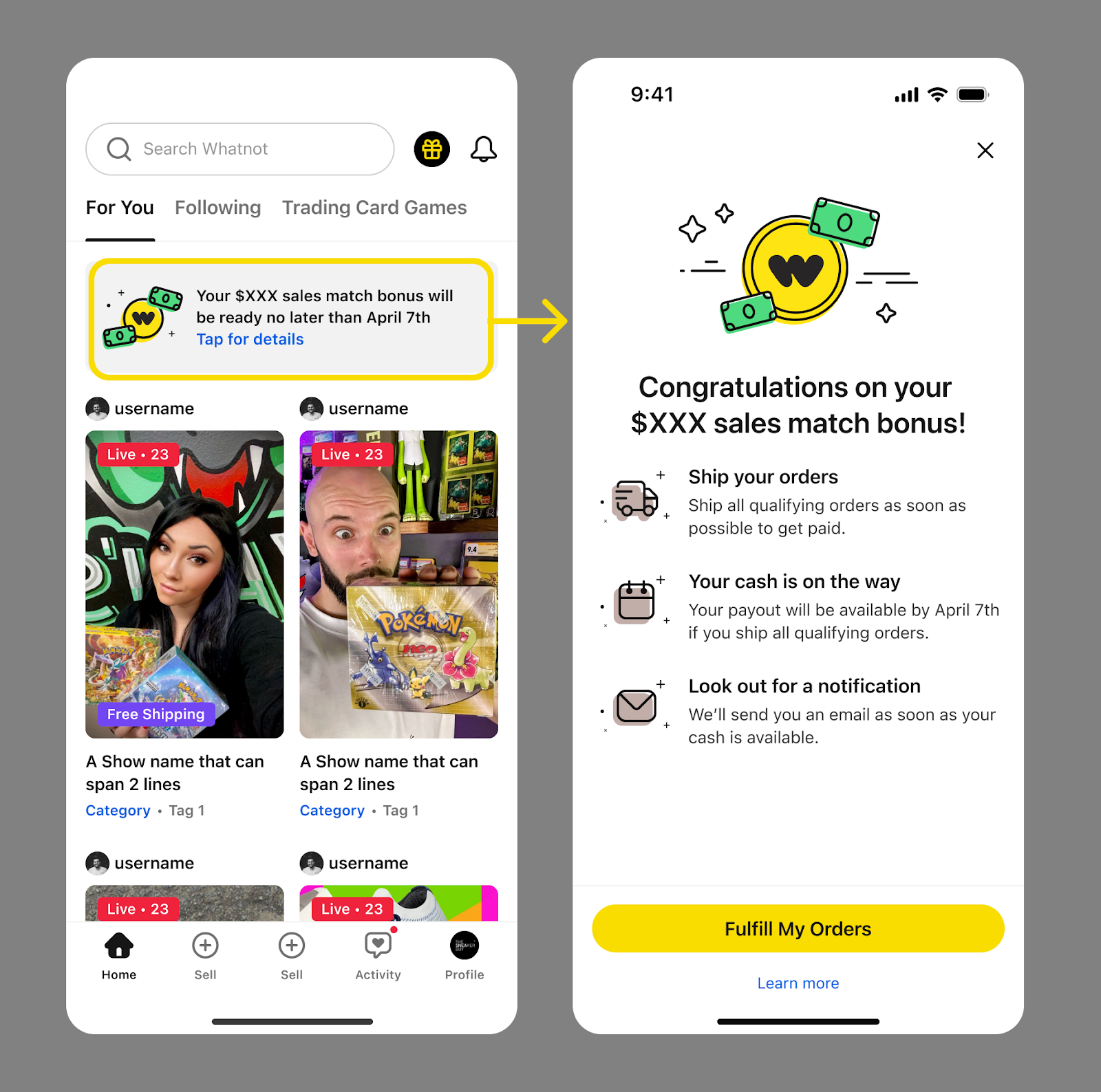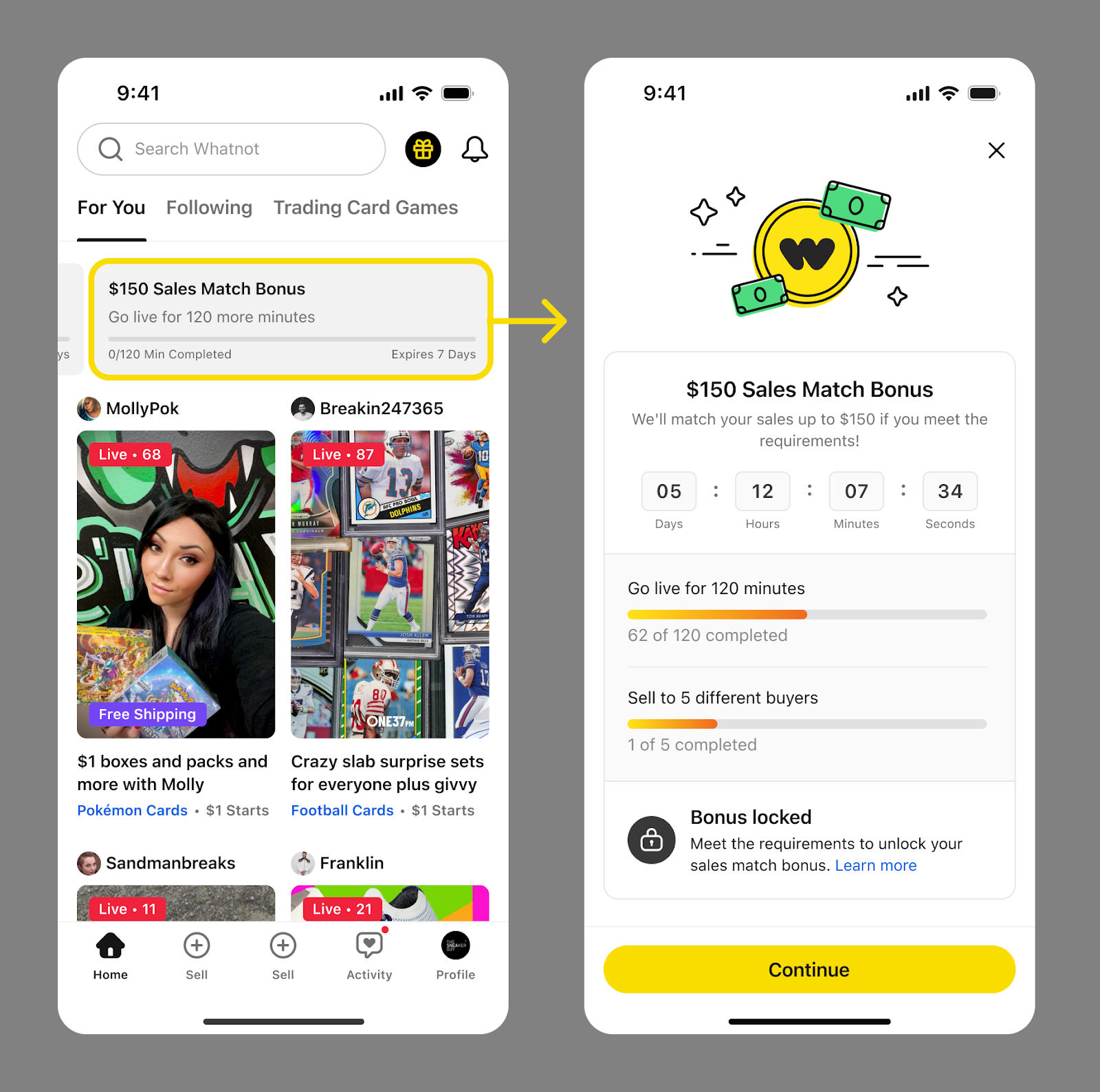 ボーナス期間は、出品権限が付与された時点で開始されます。Whatnotアプリのホームフィードには、ボーナス期間が有効であることを示すバナーが表示され、報酬を受け取るための条件を達成するまでに残された時間も確認できます。ボーナス期間の長さは、所在地や販売アイテムの種類などの要因によって異なります。