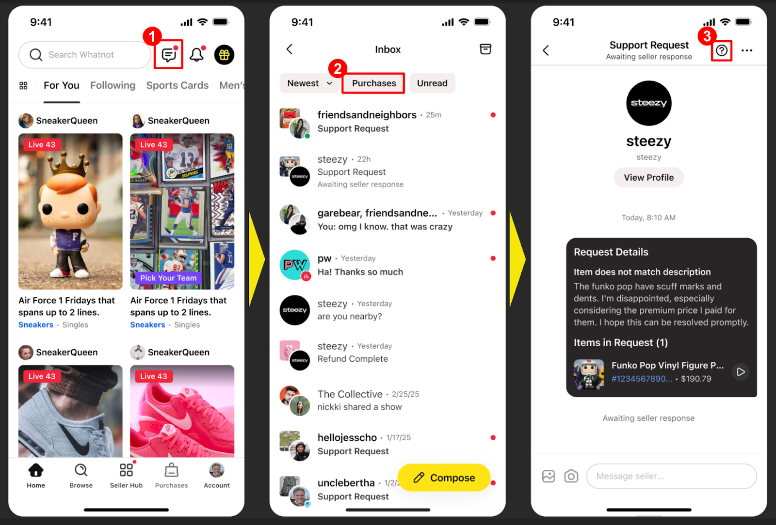 問題が販売者の対応範囲を超える場合や、直接解決できない場合、Whatnotサポートが介入して問題の解決を支援します。Whatnotは、すべての購入者に対して信頼性が高く一貫した体験を提供することを目指しています。