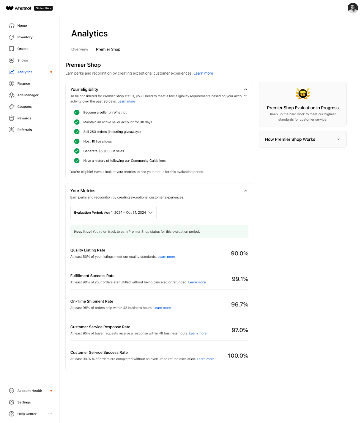 出品アカウントの分析機能で、プレミアショップのパフォーマンス基準および認定条件の達成状況の概要を確認できます。このダッシュボードは毎日更新されます。