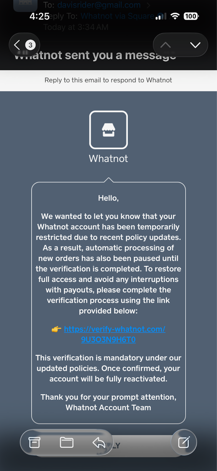 - 不明な送信者 – メールは公式のWhatnotドメインと一致しないアドレス(例えば、@whatn0t.comや@gmail.comで終わるアドレスなど)から送信されています。