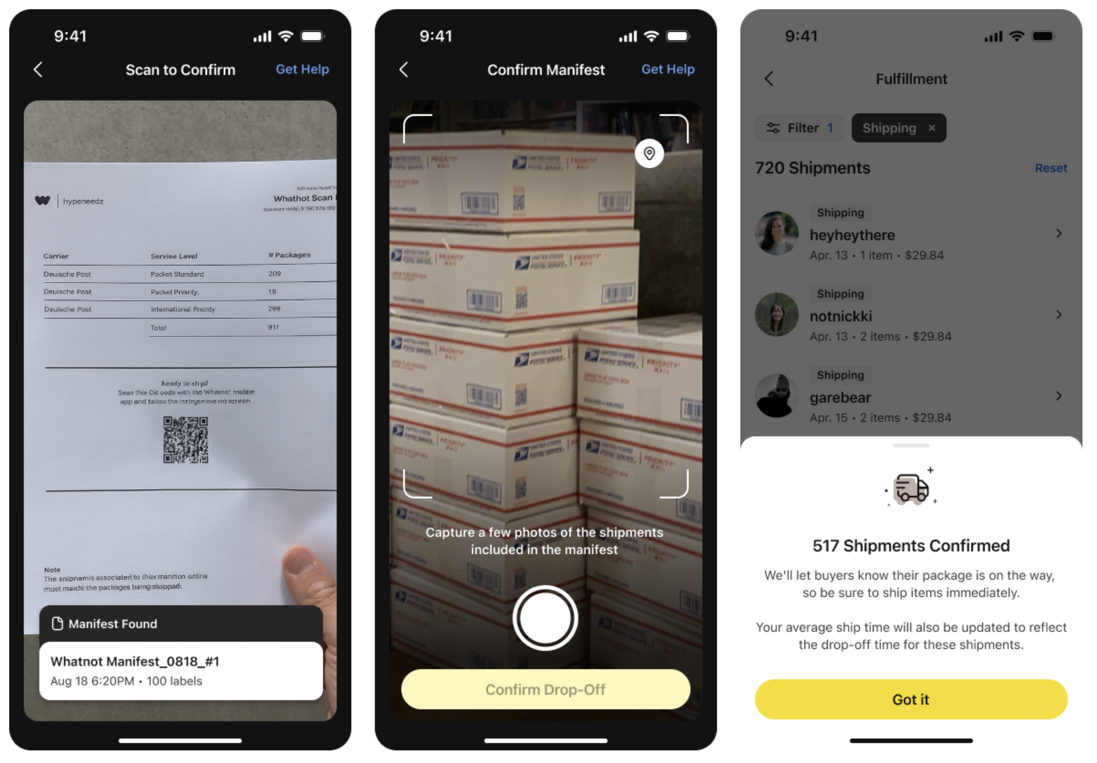 Whatnot発送リストは、発送リストに含まれるすべての荷物を発送する準備が整ってから、スキャンしてください。