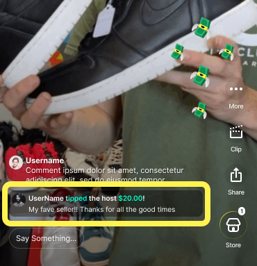 Als de verkoper meldingen voor fooien heeft ingeschakeld, verschijnt je fooi (en opmerking, als je die hebt toegevoegd) in de chat van de show.