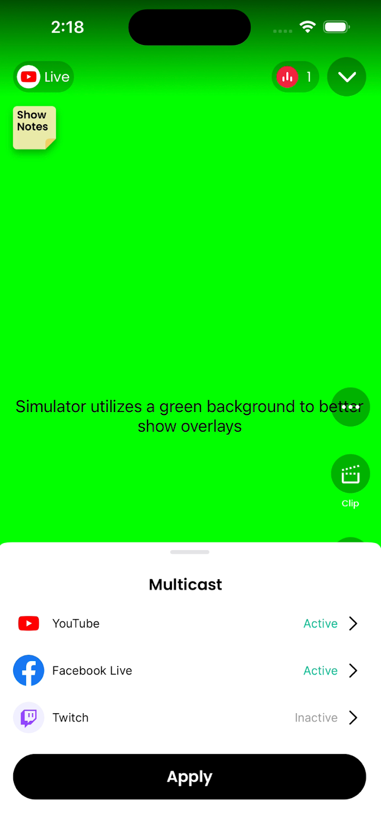 - Wanneer je 'Ga Live' selecteert op het scherm 'Wil je deze show starten?', begint je show te streamen naar elk platform dat als 'Actief' is gemarkeerd.
