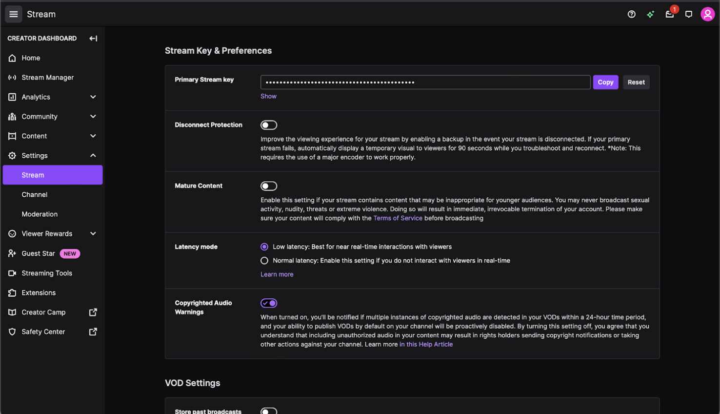 - Haal je streamcode op via het Creator Dashboard (Instellingenpictogram -> Stream). Bovenaan de pagina zie je je primaire streamcode.