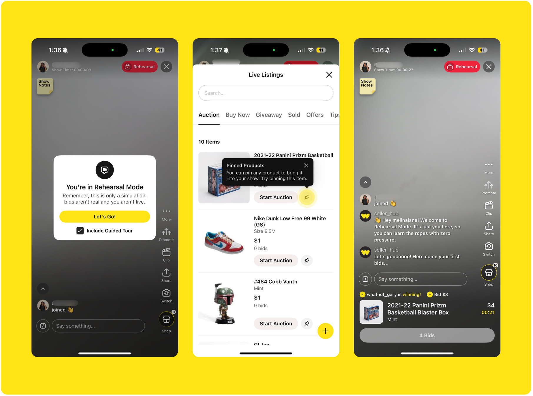 De repetitiemodus is een relaxte manier om vertrouwd te raken met live verkopen op Whatnot. In deze modus kun je een gesimuleerde show doen. De show werkt met oefenbiedingen en heeft geen echt publiek. Het is de perfecte manier om wat zelfvertrouwen te krijgen voordat je live gaat.