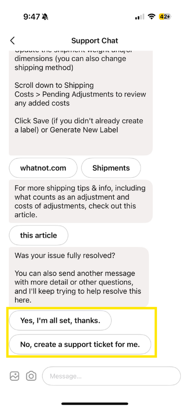 Als Whatbot je probleem niet kan oplossen, helpt het je een supportticket aan te maken, zodat een medewerker van Whatnot je verder kan helpen.