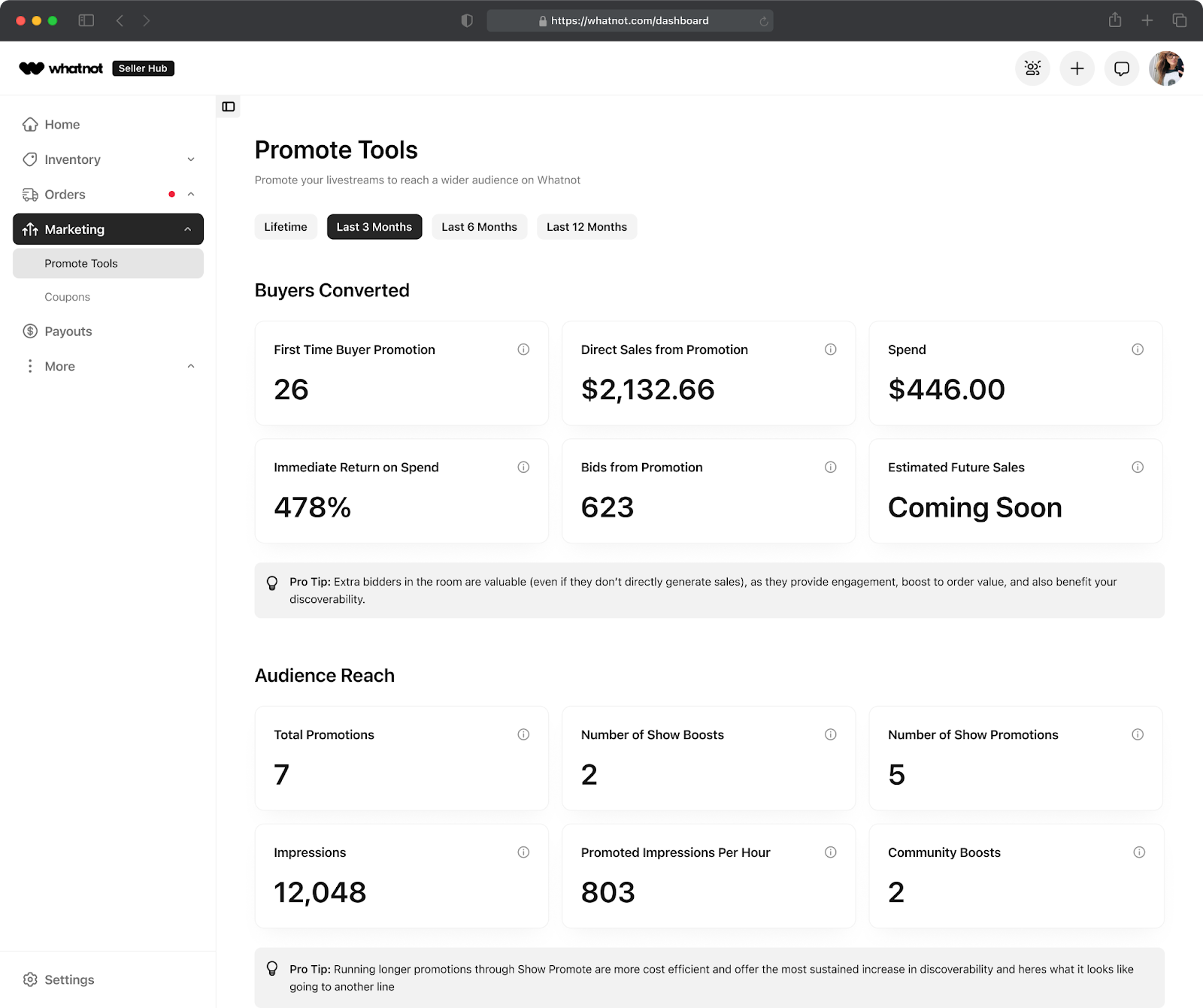 Je kunt het Promotietools-dashboard vinden door in te loggen op whatnot.com. Ga naar de Verkopershub en klik in de linkerzijbalk onder Marketing op Promotietools.
