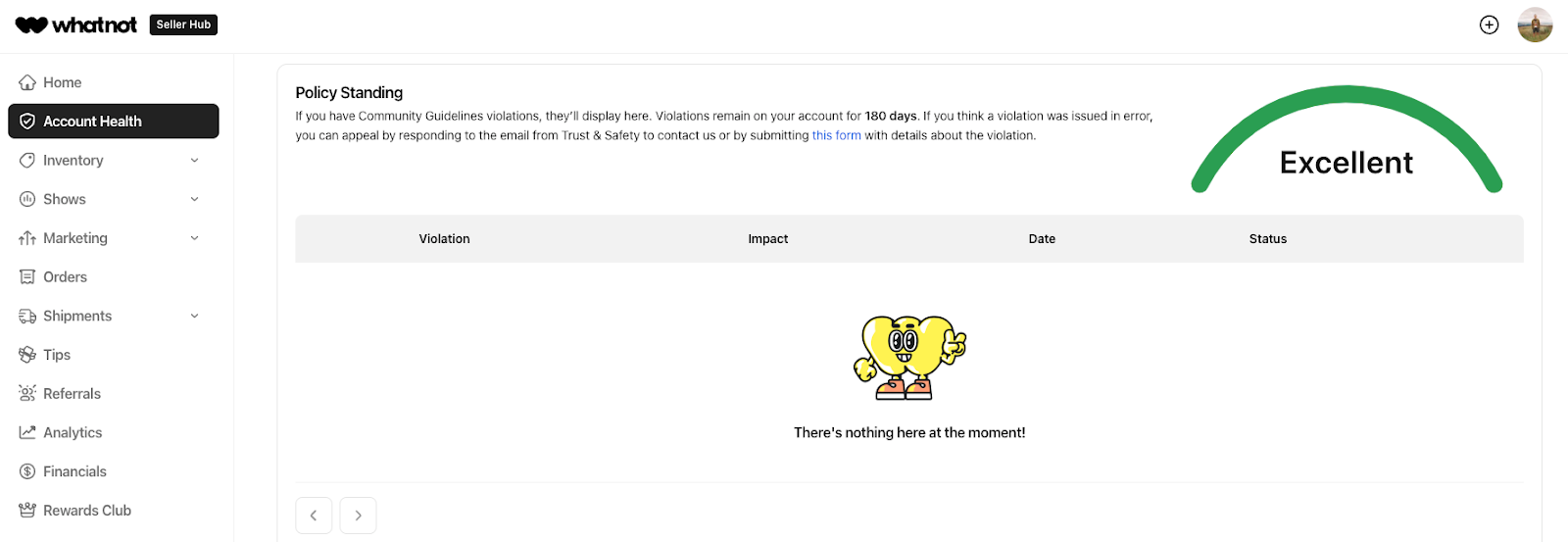 Overtredingen van de communityrichtlijnen of problemen met de prestaties van verkopers worden weergegeven in het Accountstatus-dashboard. Je ontvangt ook een e-mail van trustandsafety@whatnot.com.
