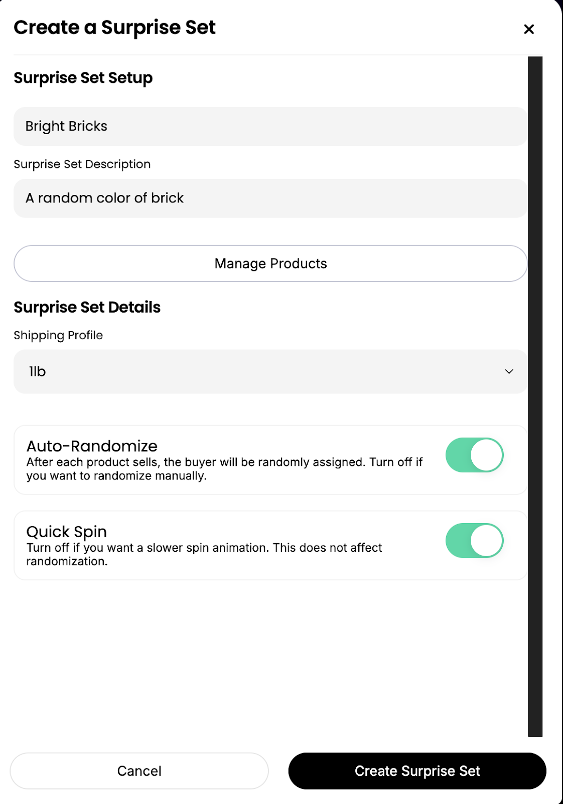 - Automatische randomisatie (standaard ingeschakeld): Wijs het verrassingsproduct onmiddellijk toe zodra het product is verkocht. Uitschakelen voor handmatige randomisatie.