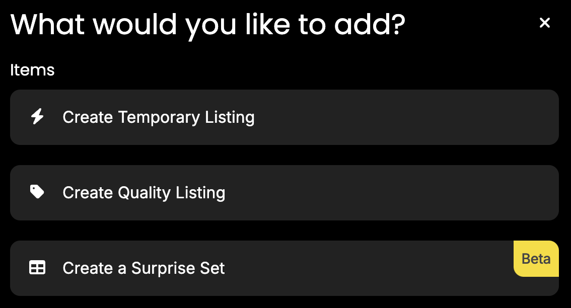Verrassingssets bieden een aantrekkelijk verkoopmodel waarbij men iets koopt dat verband houdt met de verrassingsset van de verkoper en vervolgens willekeurig een specifiek product uit die set krijgt toegewezen. Verkopers kunnen tot 500 specifieke producten van vergelijkbare typen in hun verrassingsset opnemen. Meer informatie over dit model is te vinden in ons Beleid voor verrassingsproducten. Volg de onderstaande instructies om aan de slag te gaan met verrassingssets.