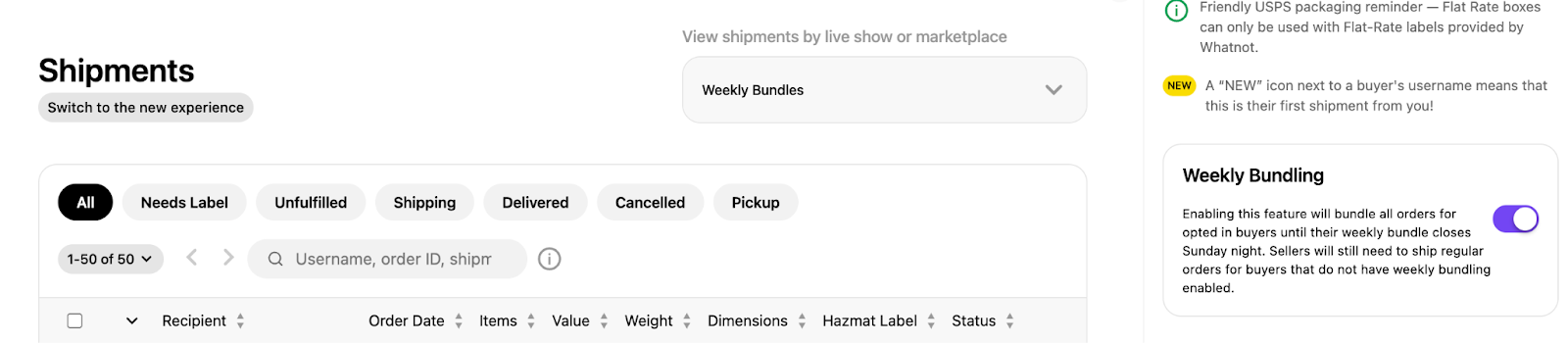 - Om wekelijkse bundels te verzenden en je alleen op die zendingen te concentreren, ga je naar Verzendingen, selecteer je 'Alle shows en Marktplaats' en vervolgens 'Alleen wekelijkse bundels weergeven' in het filter. In deze weergave zie je zowel openstaande als afgesloten wekelijkse bundels.