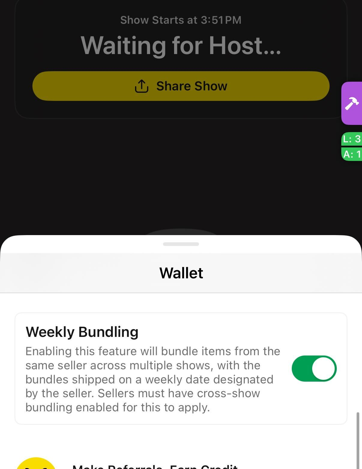 - Voor streams van verkopers die de functie hebben ingeschakeld → Wallet → Wekelijkse bundeling → Inschakelen