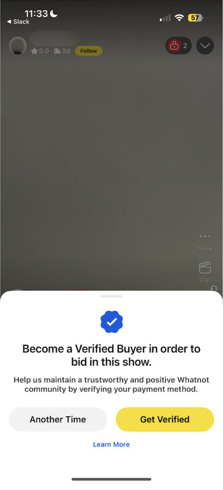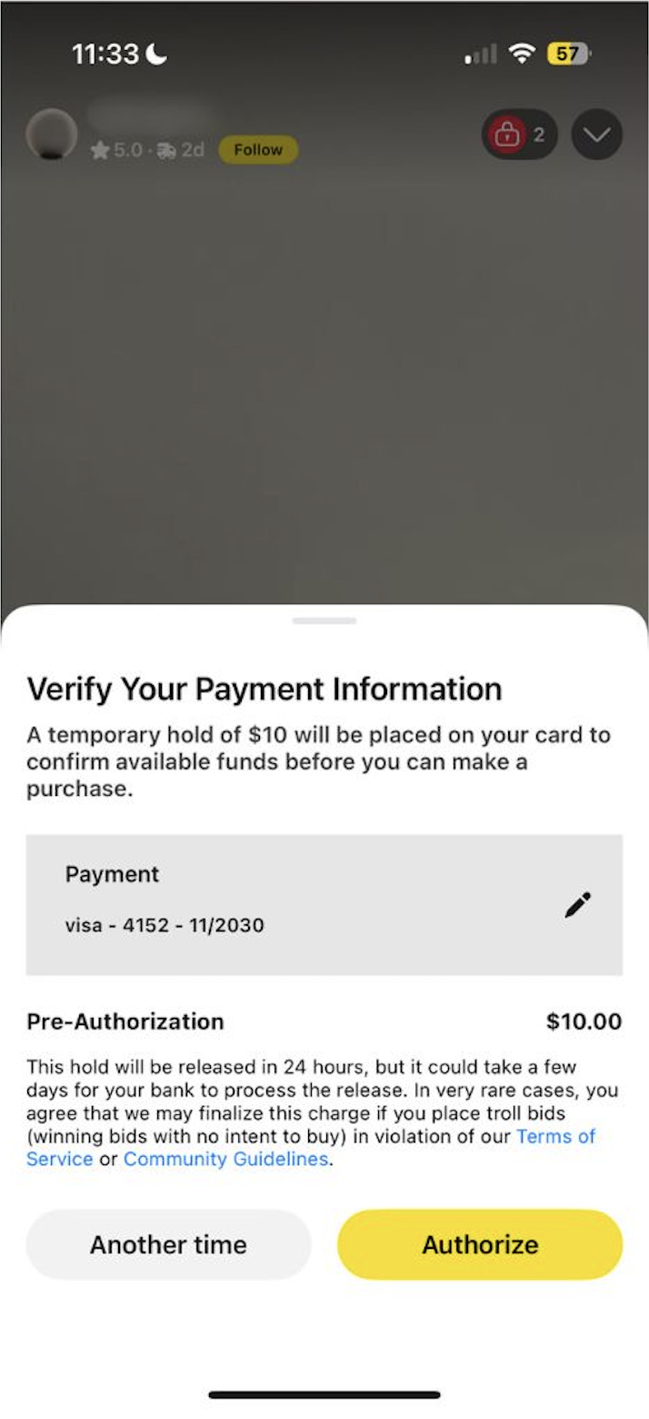Als een verkoper kopersverificatie vereist voor hun show, word je gevraagd om je betaalmethode te bevestigen voor je eerste bod of als je meedoet aan een giveaway.